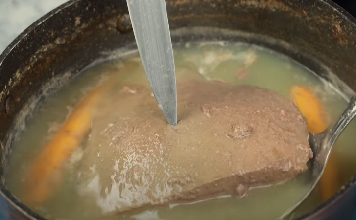 Саму печень отвариваем в кипящей воде, а для аромата добавляем репчатый лук, морковь, лавровый лист и черный перец. Солим печень только за 10 минут до готовности, всего печень варится около 30 минут.